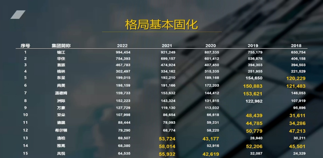 从2018年到2022年这5年期间,饭店集团在规模的格局上基本固化了。