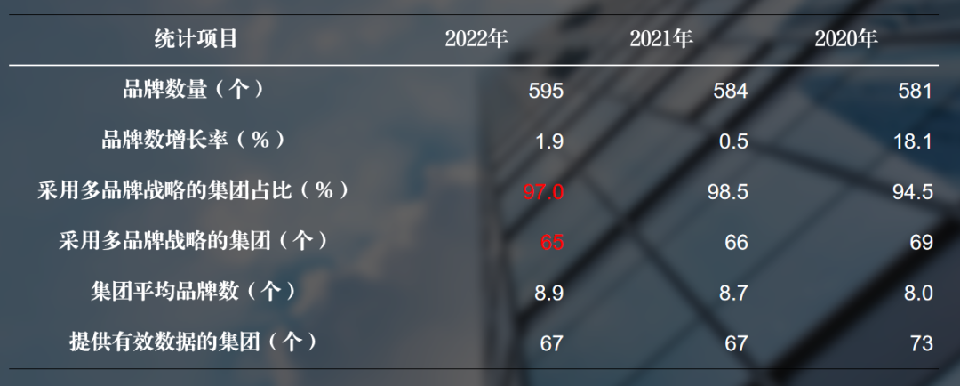 从近三年饭店集团品牌发展趋势来看,总体上是稳定的。红色标注的2022年数字比2021年有所下降,但降幅不多。如果再考虑到统计误差,这两个数据与2021年相比大体持平。