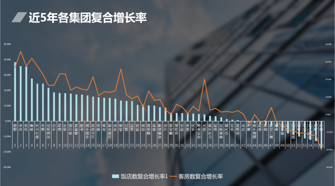 再看近5年各集团复合增长率。总体上是相当不错的,下图中显示有全面数据的56个集团中,绝大部分都保持着正增长。排名42位以下的集团是负增长,其中有的是客房数下降了,有的是饭店数下降了,也有的是双双下降。