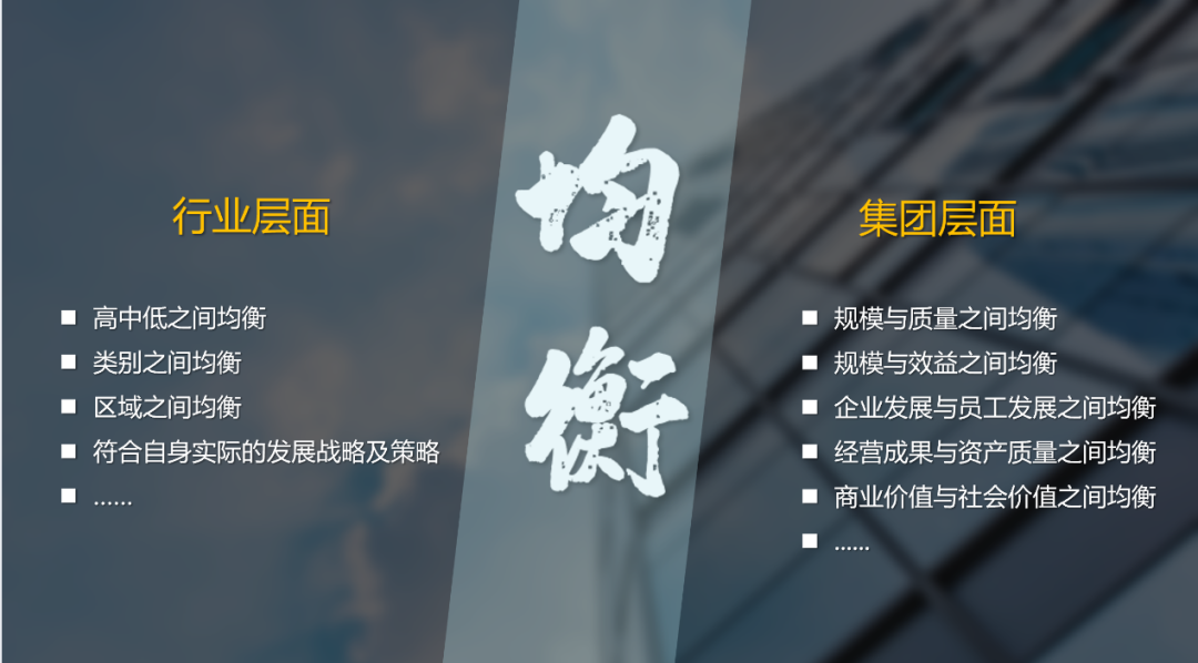 而集团层面的均衡,要关注以下几点:其一,是规模和质量之间的均衡,一些集团这些年太注重规模扩张,对质量强调不太多,规模是要追求的,但同时也需要在规模和效益之间实现均衡;其二,需要关注企业发展和员工发展之间的均衡,员工被忽视,企业难发展;第三,要关注生产经营与资产质量之间的均衡,第四,更要关注商业价值与社会价值之间的均衡。