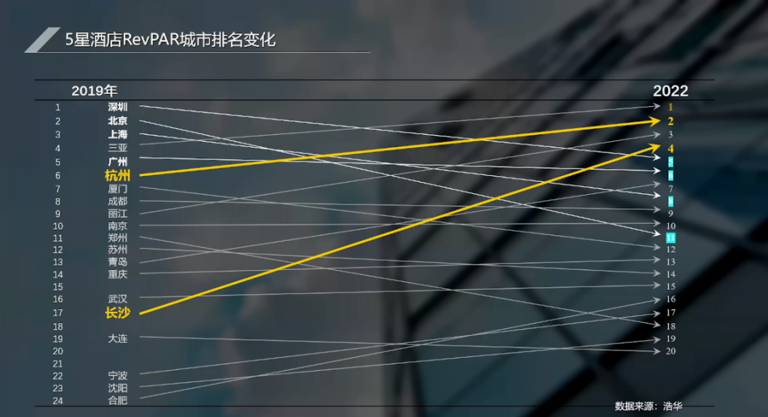 我再给大家展示一下浩华近期发布的近三年不同城市五星饭店RevPAR排名变化情况,2019年居于高位的是深圳、北京、上海、三亚、广州,而三年过后,除了三亚冲到第一,其他一线城市均往下掉。而杭州、长沙还有几个城市在火速往上冲。