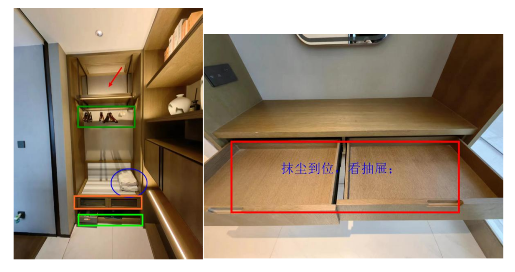包含进门过道、各柜子空间检查(有无遗留物品)、各柜抽屉检查(物品与卫生)、消防用品检查、保险柜检查、衣架检查、上部空间卫生、柜门合页检查,过道处的空调开关及模式温度设置等;