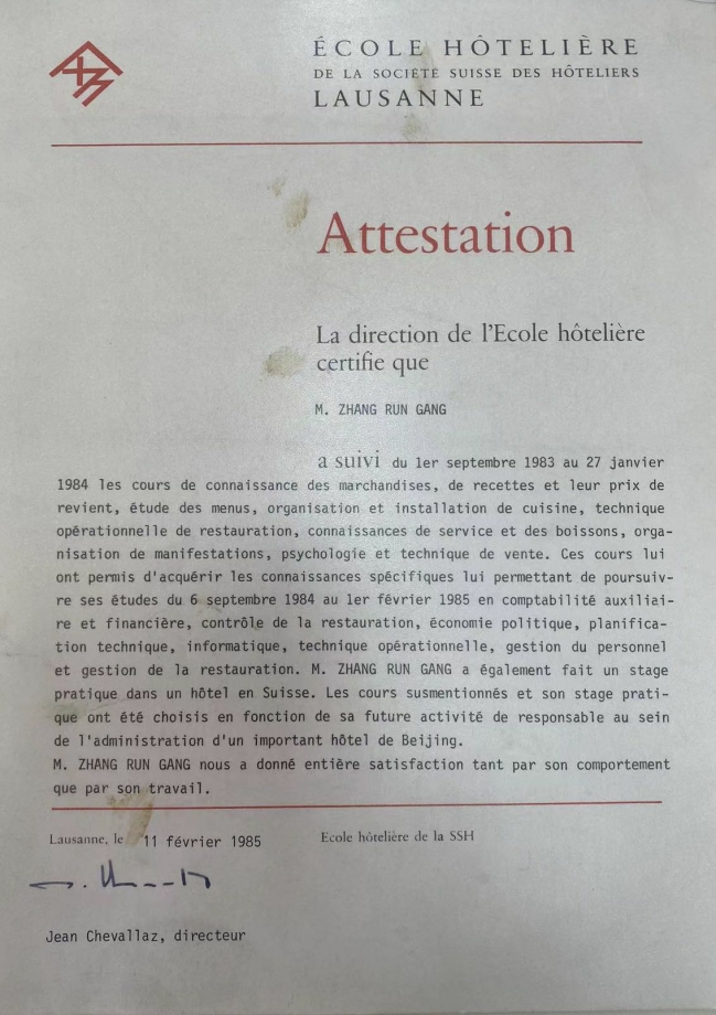 那个时期,EHL的学制还是三年半,在此期间把课程全部修完并经考试合格后,可以拿到学校的正式文凭(Diplôme)。而我在EHL是进修,学习时间不足两年,学的课程有所精简和合并,最后得到的则是结业证书(Attestation)。