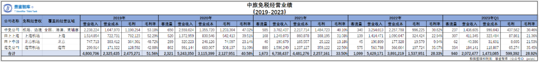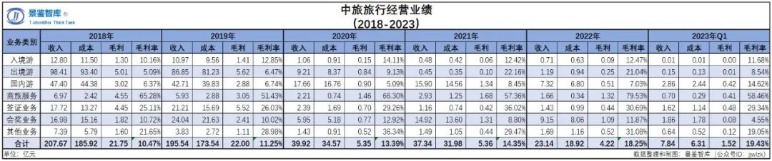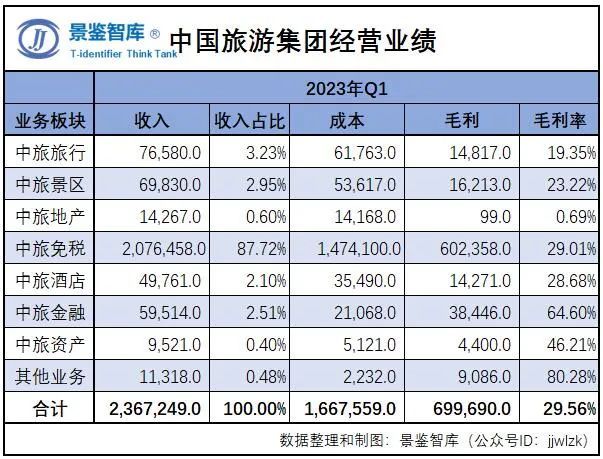 景鉴智库获取的中国旅游集团合并报表各板块经营情况(2018-2023Q1)如下: