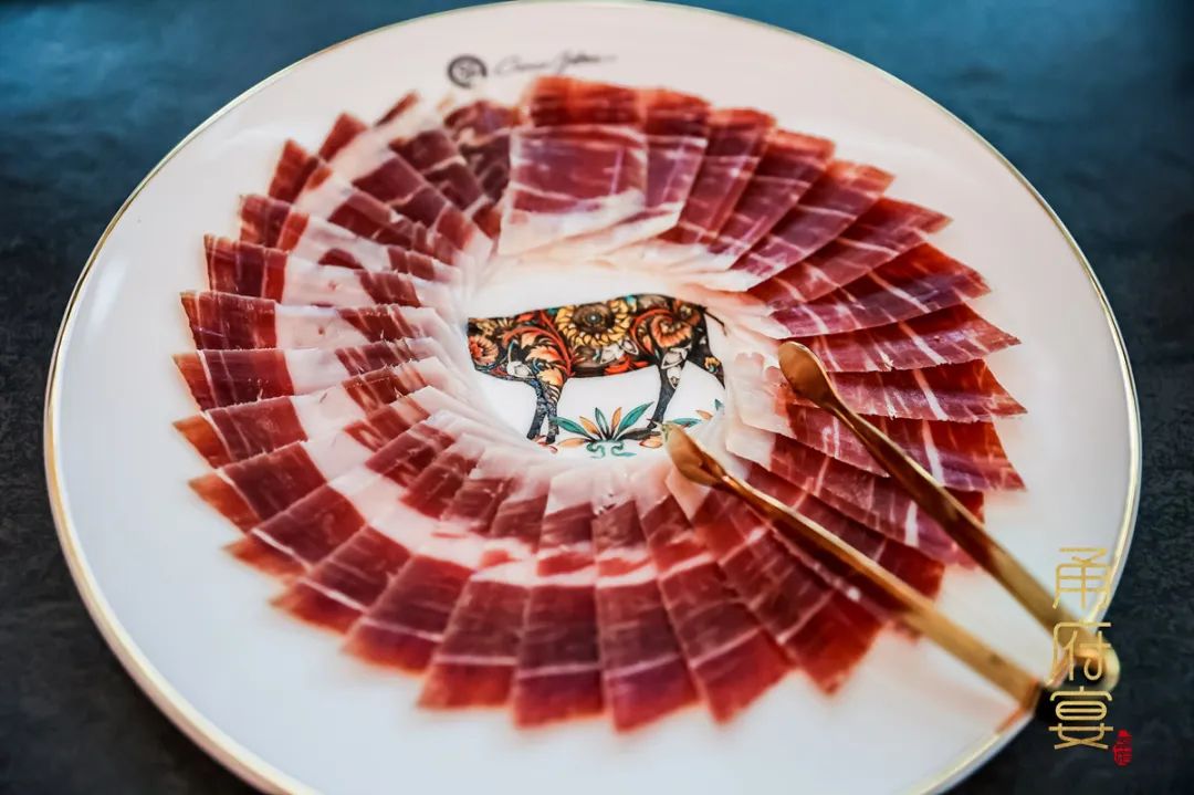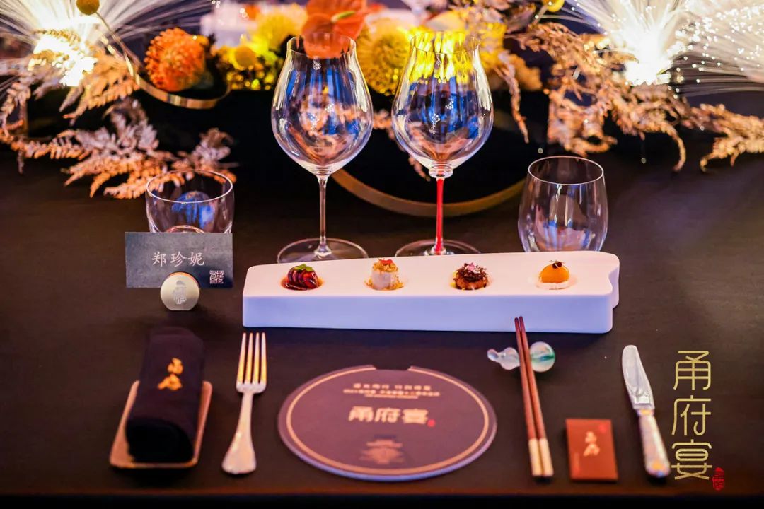 场景与摆台。甬府宴12周年庆典的内外景致可用“高雅、恢宏、摩登”来形容。两组150人席位的长方形餐桌气派非凡,台面配置的席卡、直播二维码、餐盘、口布、鲜花、菜单格调高雅,精美至极。餐厅外面是黄浦江及两岸景观,“三件套”和万国建筑群尽收眼底,气势恢宏。宴会厅大屏幕、灯光、背景音乐与外面跳跃在楼宇、江面上的光影交相辉映、相映成趣。“视觉、听觉、味觉”之美相互交融,尽显摩登,令人震撼。那是美妙旋律的前奏,是甬府宴给我留下的深刻印象。
