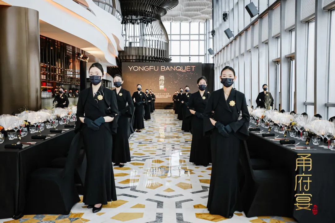 服务与服装。甬府宴的服务堪称国宴级,服务员热情好客、端庄大方。服装款式经典、雅致、新潮,既能凸显线条美感,又能便于服务作业,宛如一道动态的风景线。本次庆典的九道菜品出菜前,均由翁拥军大师亲自讲解。高端甬府宴的取材寻味之地道、加工工艺之严苛,可谓登峰造极。不时不食、追求味正、装盘点缀如诗如画,味鲜之极,形美之雅令人叹为观止。菜品讲解更是服务的重要内容和一大亮点,服务的标准化来自于国宴,个性化则来自于甬府的自创,当标准化与个性化有机结合时,服务的附加值便大幅度提升。好的服务能让宾客受宠若惊、喜出望外,这便是中国服务的魅力所在。