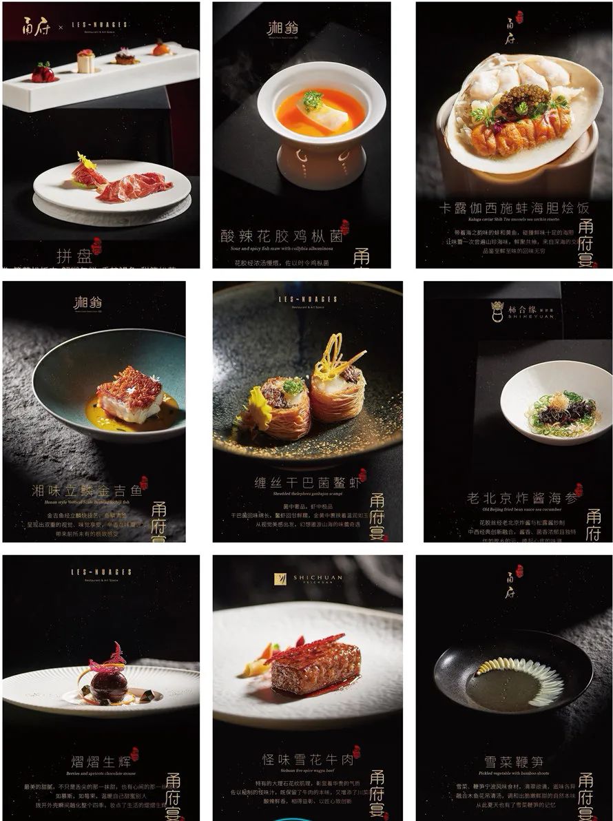 菜系与菜品。甬府宴共九道菜品,罗盘旋转式菜单设计独具匠心,甬菜、湘菜、川菜、京菜、上海菜、法式西餐完美融合。既有地道的宁波口味,又有来自全国各地和世界的味道,融合范围之广,跨度之大犹如交响乐,让人感受到高山流水般的魔力,令人陶醉。菜品色、香、味俱佳,从最根本的味蕾满足走向对东方美学宏大意境的极致追求,这是一种品位和精神层面的升华。获“黑珍珠、米其林”等诸多殊荣当之无愧!