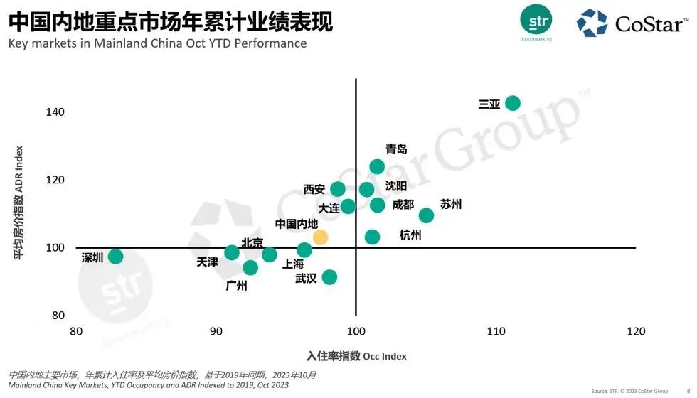 暑假期间,各地酒店的生意火爆,酒店同行们可谓喜笑颜开。十一期间的相关数据更是创了新高,根据STR发布的数据来看,其中全国的平均RevPAR已经达到了2019年的112%。然而景气指数却从第一季度后一路下滑至第四季度64。不过,即便下滑至此,也仍大大地高于2019年同期的-32。
