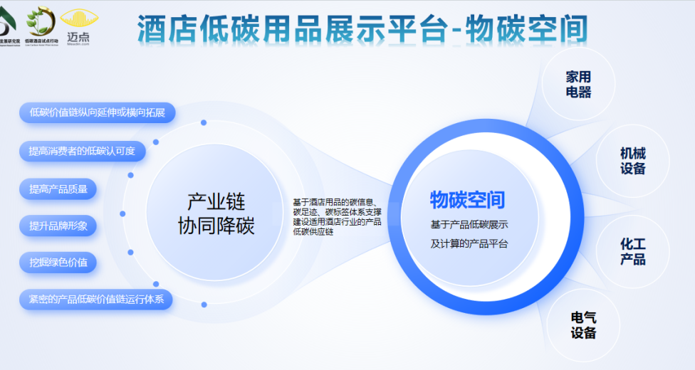 工作组把计算并展示酒店应用产品碳足迹及碳信息作为重要工作之一,建设了基于产品碳足迹、碳信息数据库建设、低碳产品研发、展示及计算的物碳空间。