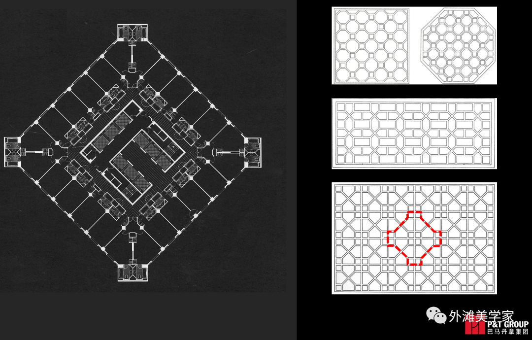 金陵楼的设计,巴马丹拿集团参考了南京经典建筑的对称式布局,提取中式窗棂元素,窗花中的独立单元,将其具象为对称的塔楼标准层平面。整个设计,着重清晰的节奏,并用精致的白色马赛克,装饰所有的梁柱,使主题更突出,外观更统一。