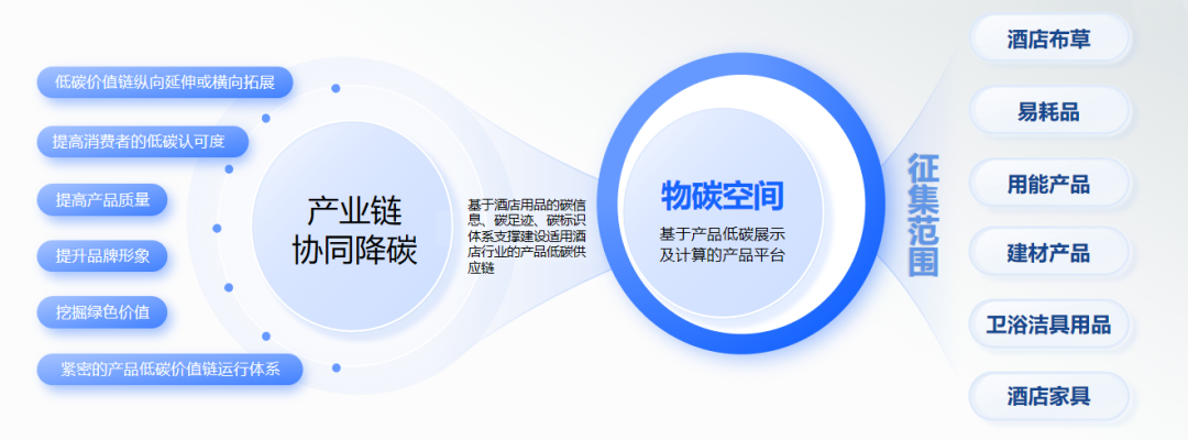 打造基于产品碳足迹、低碳产品研发、展示采购及消费选择的产品、展示、采购、服务一站式平台—“物碳空间”,已相继开展酒店行业领域产品碳足迹背景数据库建设、酒店用品核算规则办法研究与制定、搭建产品碳足迹计算与认定平台、开展低碳用品提升酒店新消费策略研究及消费品领域的酒店用品及产品的推广与应用。