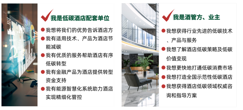 酒店低碳发展研究院以试点机制探索酒店有序减碳路径,以酒店低碳发展研究院保障低碳酒店试点工作实施,由国家级社会组织,科研院所及酒店行业头部应用技术、产品单位共建的联合创新平台,服务于酒店行业低碳发展解决方案的创新研究及产业协作支撑。