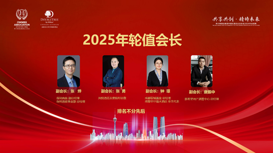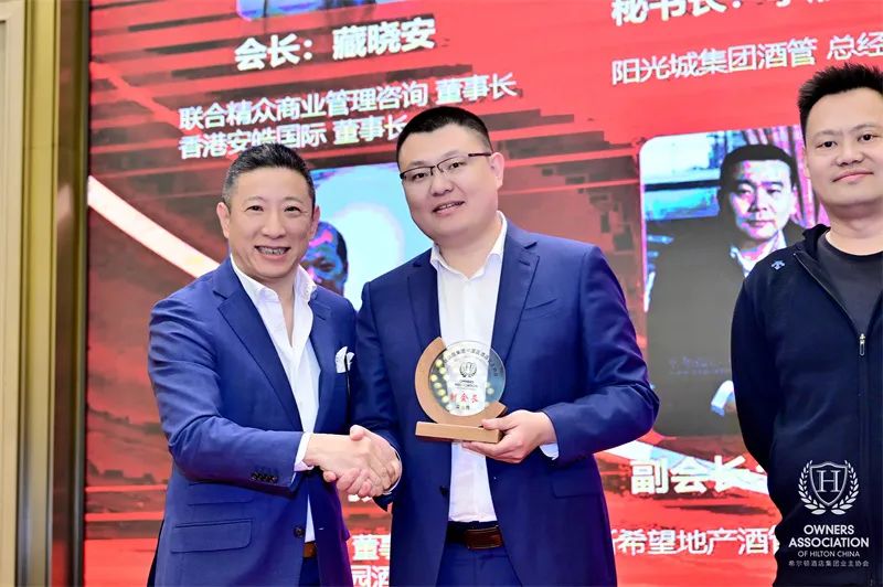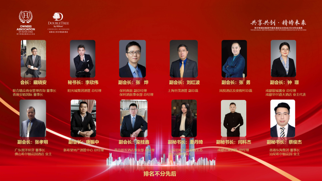 希尔顿酒店集团中国区业主协会于2024年4月正式完成领导层换届选举,并在4月12日在成都举行的业主协会年会上对当选协会领导进行了授牌,本届领导层的任期两年,自2024年4月12日至2026年4月11日截止。