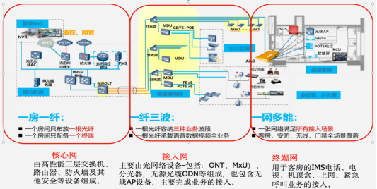 一方一纤、一纤三波、一网多能,解决传统酒店信息化系统复杂、建设成本过高,提升网络平滑升级,兼容未来业务发展,提升无线信号覆盖盲点区域,降低复杂的施工布线,提升整体的美观度。