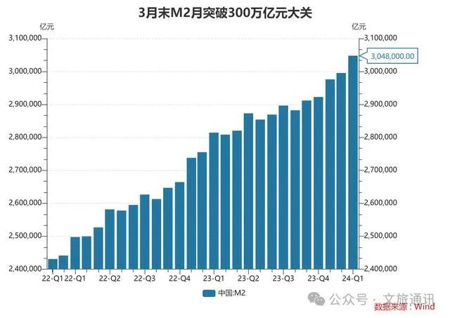 看似火爆的旅游市场,人数在不断增长,游客的消费真的增长了吗?我们来看另一组数据,截至2024年3月底,国内的M2正式突破300万亿(M2主要构成为流动中的货币、企业活期存款、个人存款),达到304万亿,超过了很多发达国家,而2019年5月的M2是189万亿元,增长速度超过38%。