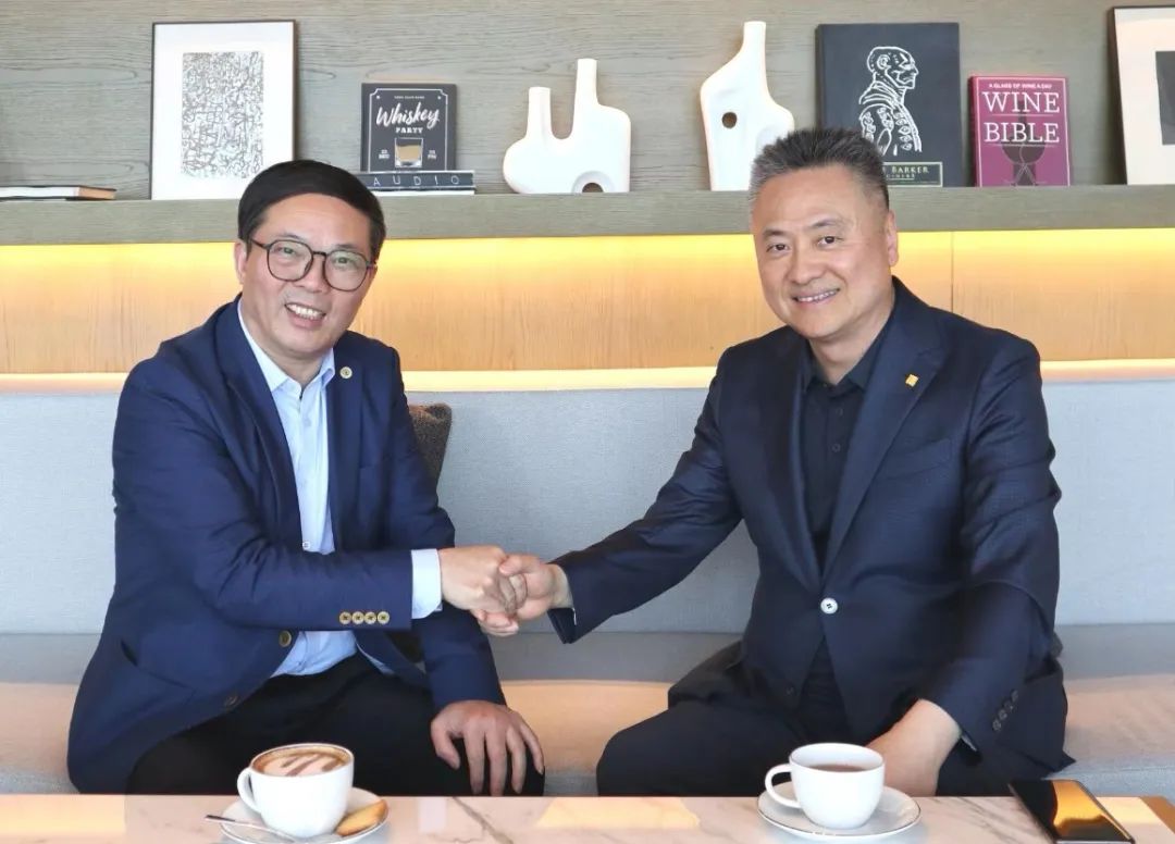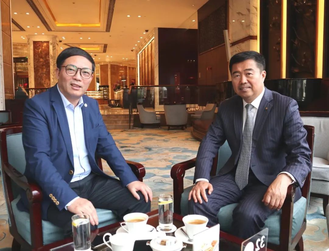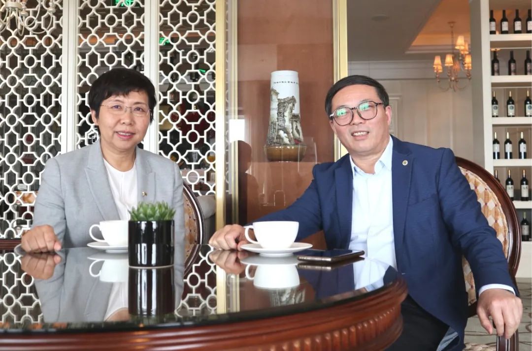 特色酒店联盟秘书长钱三毛(右)与哈尔滨松北香格里拉总经理黄分明交流访谈