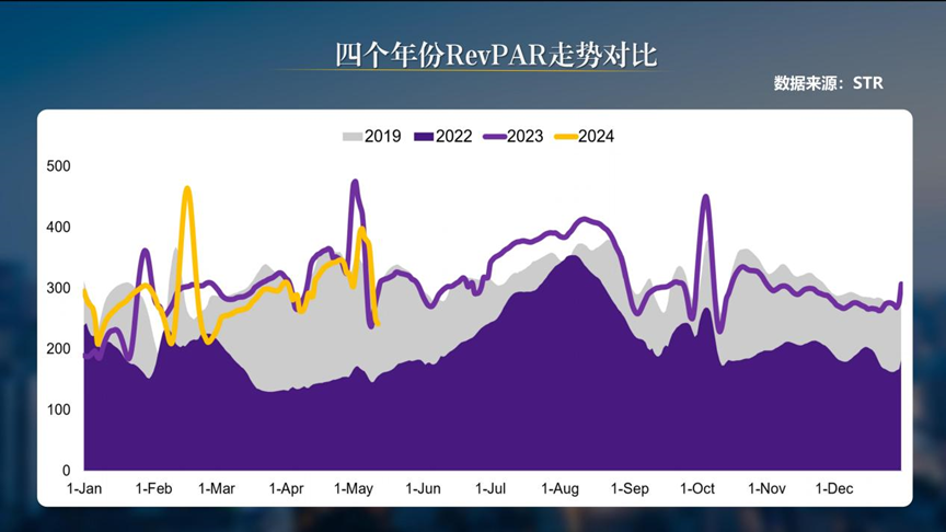 需要注意的是,STR数据表明,2023全年和今年一季度,行业的走势一直都是周末好、平日差。如果换算成客源结构,那就是旅游的多,商务的少。