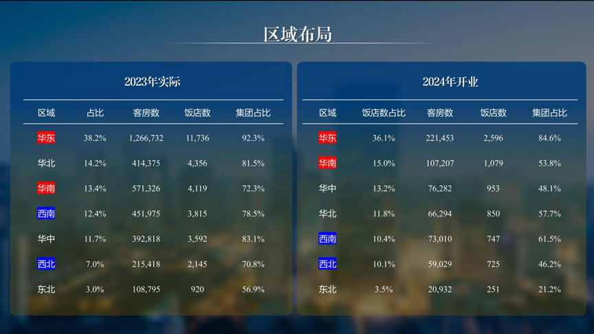区域布局方面,2023年各集团的布局突出集中在四线及以下城市和新一线城市,相关资料也显示了中国不同档次城市饭店连锁化率情况。两个统计结果显示,在四线及以下城市的潜力和挖掘方面是同频的。
