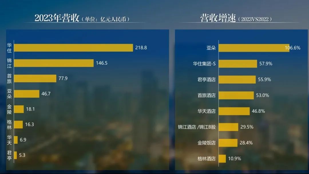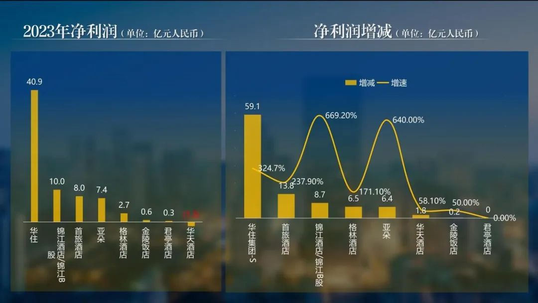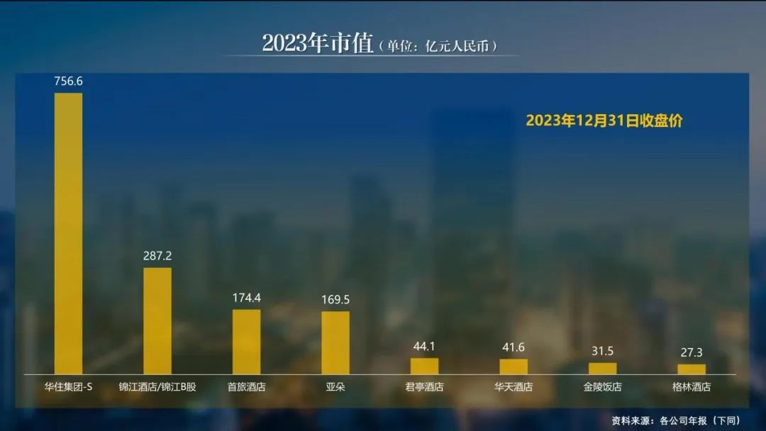 首先是市值,按照2023年12月31日的收盘价,排序是:华住、锦江、首旅、亚朵、君亭、华天、金陵、格林。