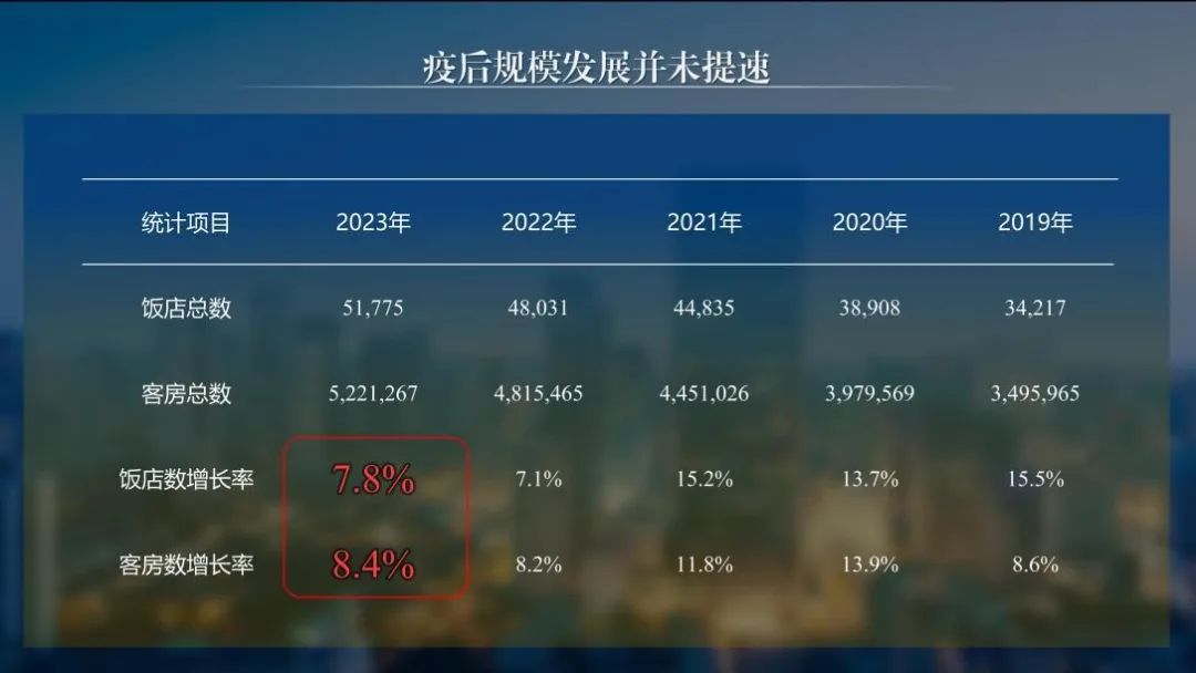 2023年是疫后第一年,业界曾经期待的饭店集团规模加速发展的情况没有出现。饭店增长率是7.8%,客房增长率是8.4%,只比2022年略高,相对于2019年和之后的两年都有所下降。
