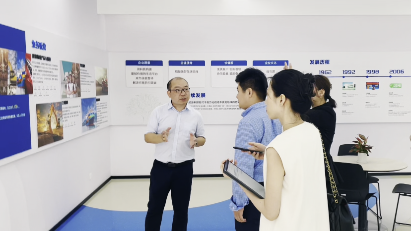 广州立邦涂料有限公司粤海销售大区总经理张元、厂长赵泽成、产品经理张然出席接待,双方就立邦低碳路径探索与综合场景创新低碳产品推广应用展开合作交流。