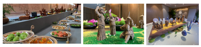 “古都丝路饺子宴”的创意背景和主题线路是:以长安(即西安)为丝绸之路起点,以波斯为终点,以联合国丝绸之路非遗保护名录为依据。具体来说,即用大雁塔和玄奘和尚西行代表长安、用维族老人弹东古拉和维族少女跳民族舞代表西域、用驼队穿越沙漠代表中亚、用古老的清真寺和清真壶代表波斯等一系列的艺术品来做装饰。这些地标性的文化符号,都用泥塑的艺术手法表现出来,彰显了丝路沿线国家的地域风貌和风土人情。这为“古都丝路饺子宴”的饺子馅的分类,提供了依据和故事材料。