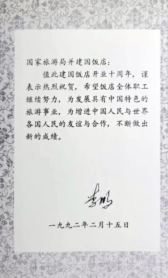 在建国饭店开业八周年的时候开始办《建国报》,及时宣传中外方员工的精神风貌和感人故事。编写了《建国饭店之歌》,每逢开会齐唱这个团队精神之歌。在开业十周年时,万里委员长为我们题词“卓有成效的十年”;李鹏总理发来贺信,鼓励我们再接再厉,勇攀高峰。这一年我们编写了关于建国饭店管理的书,又捐款在中共“洛川会议”旧址附近的陕西省铜川市建立了一所希望小学,还组织中外员工一起到北京朝阳公园植树,种植了888棵树的“建国林”,直到现在我们还经常到那里散步聊天,回忆那难忘的岁月。