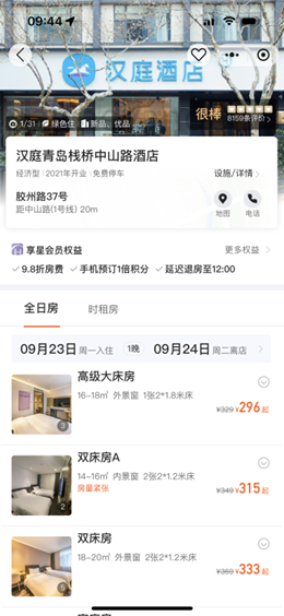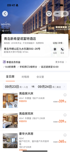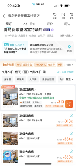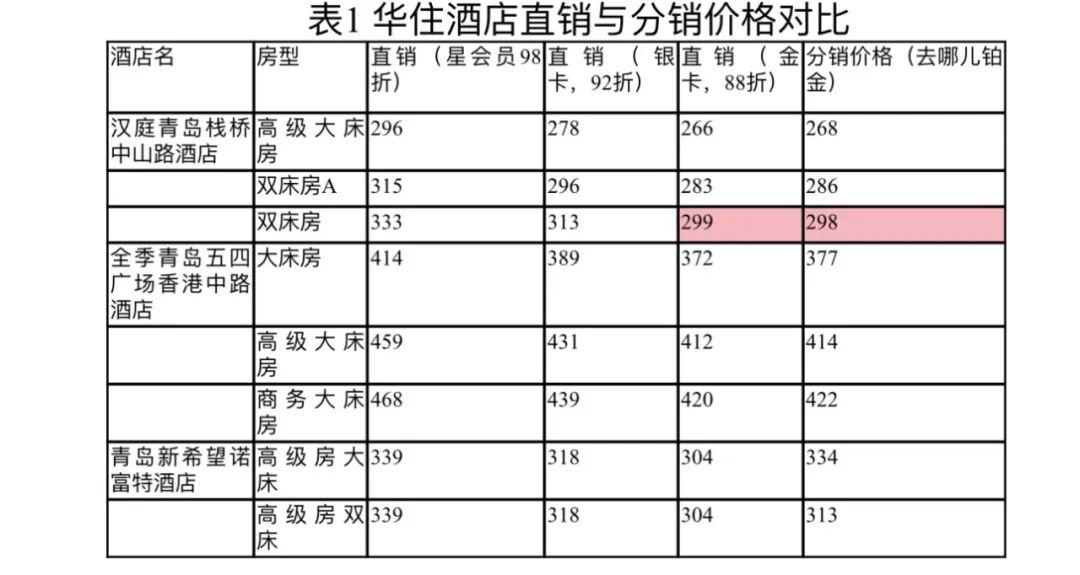 用调研数据举一个例子:9月21日随机抽取不同档次三家酒店,覆盖诺富特、全季和汉庭三个品牌,在华住直销渠道(微信小程序)和分销渠道(去哪儿App)预订9月23日客房,得到的价格如下表: