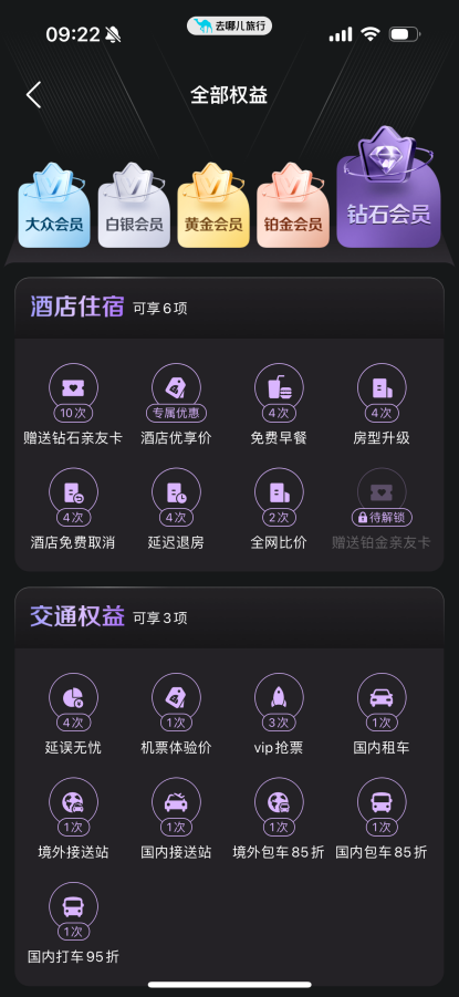 从会员权益看,也是互有胜负,华住金卡才能与OTA铂金对抗,金卡在餐饮和退房有优势(每次入住1份早餐、14点退房),而去哪儿铂金权益更综合(每年早餐2份,延迟退房2次),还拥有房型升级、免费取消,尤其是交通、租车、金融等综合权益,是OTA对抗酒店会员的有效手段。