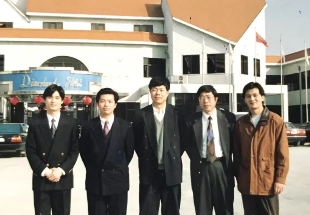 右二:国家旅游局旅行社饭店管理司司长魏小安;中:国家旅游局计划统计司司长邱毅勇;左二:昆山淀山湖旅游发展总公司总经理、淀山湖宾馆总经理钱三毛(摄于1994年)