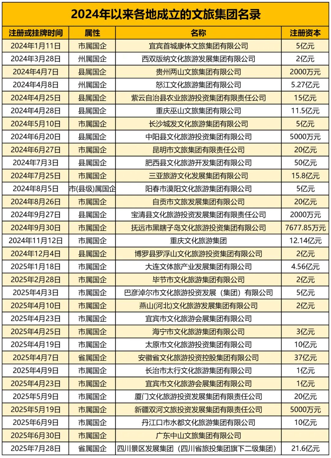 根据作者统计,自2024年至2025年8月中旬,省、市、县(区)各级新挂牌成立的国资背景文旅集团达32家,业务版图涵盖景区投资运营、酒店管理、房地产开发、康养旅居、汽车租赁、会展策划、数字文旅、体育赛事、乡村旅游等多个领域,呈现“全产业链布局”特征。